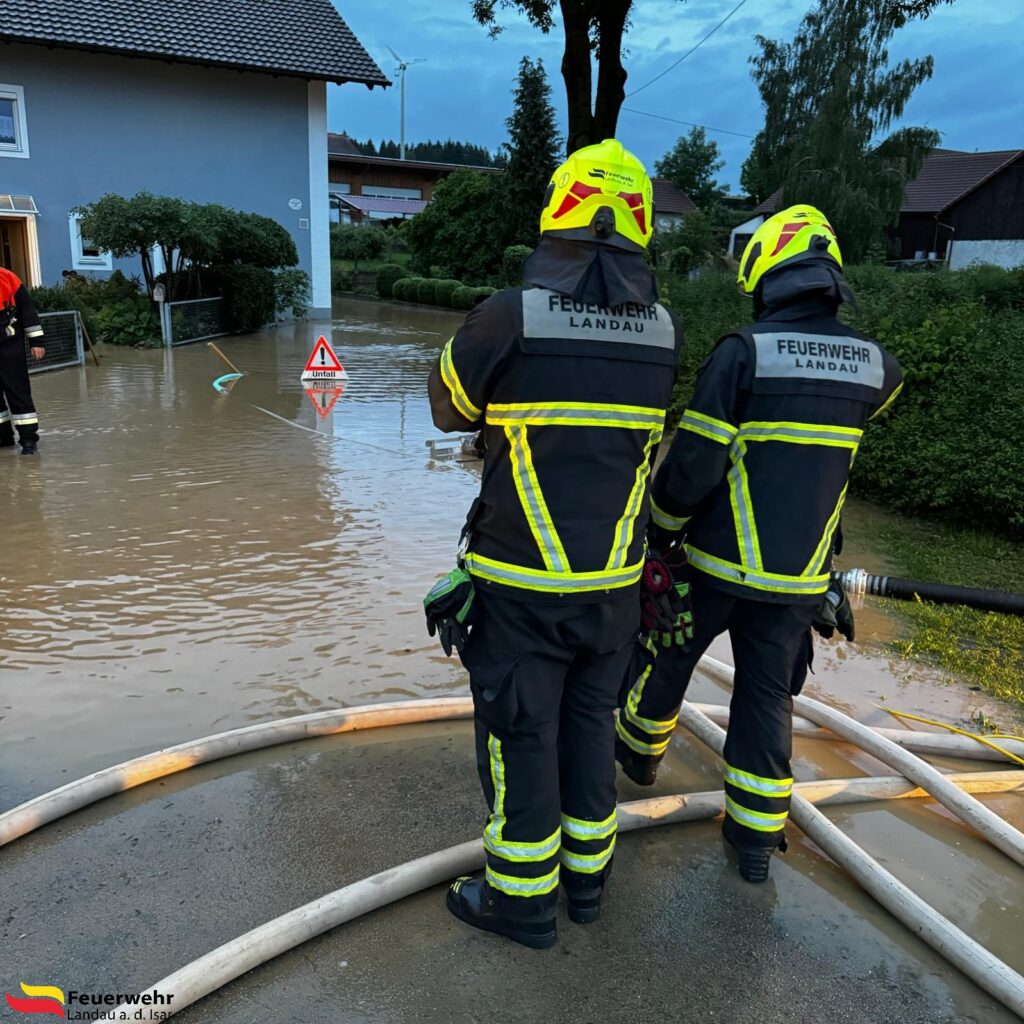 Nachforderung durch die FF Möding; großflächige Überschwemmungen nach Starkregenereignis im Ortsgebiet; Transport von Sandsäcken; mehrere Nasssauger und Schmutzwasserpumpen im Einsatz