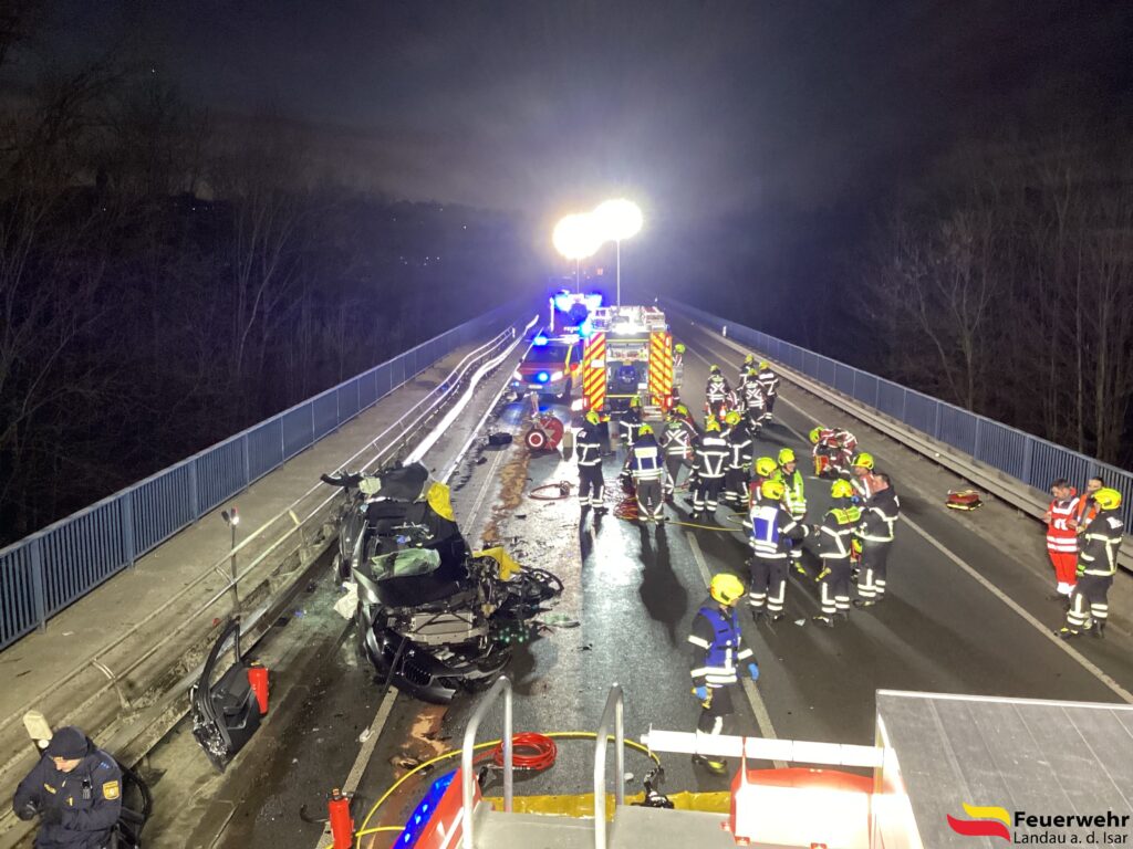 Verkehrsunfall zwischen Bus (leer) und PKW; Frontalzusammenstoß, PKW-Fahrer eingeklemmt; Technische Rettung der eingeklemmten Person in Zusammenarbeit mit der Feuerwehr Pilsting; Betreuung und Erstversorgung des Busfahrers; Ausleuchten des Hubschrauberlandeplatzes; Absicherung der Einsatzstelle; Brandschutz sichergestellt; Unterstützung Abschleppdienst und Straßenbaulastträger bei der Reinigung der Bundesstraße